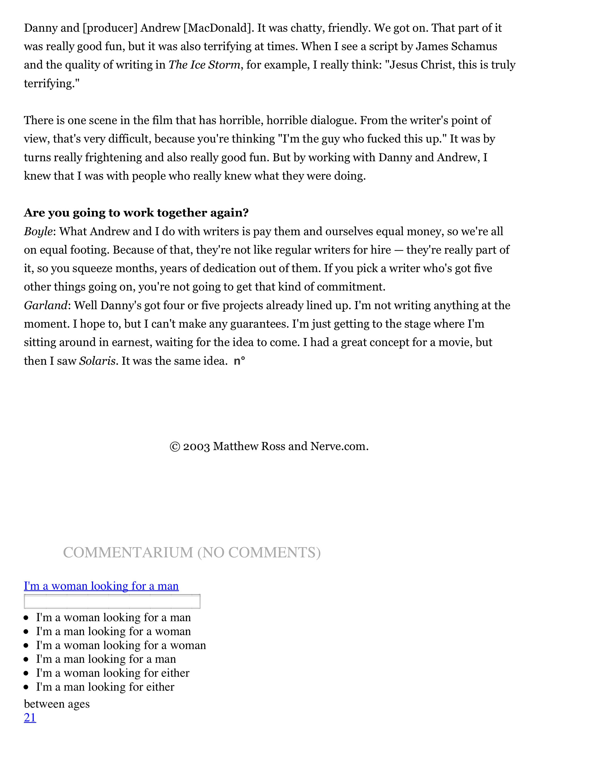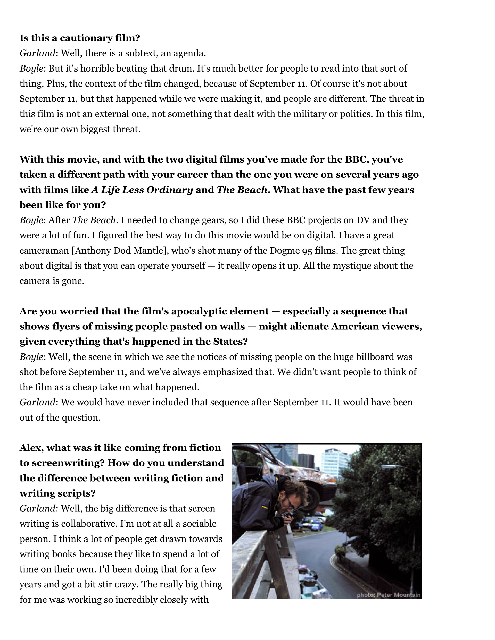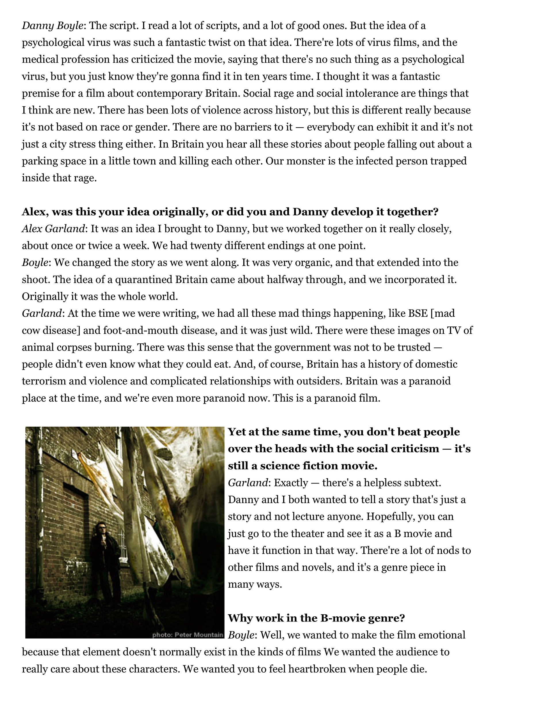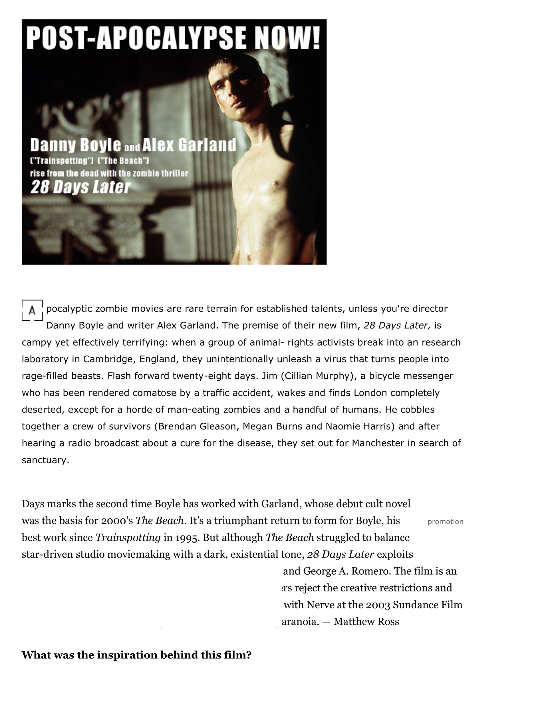 Feature story and interview with Danny Boyle and Alex Garland about their film 28 DAYS LATER for Nerve.com.