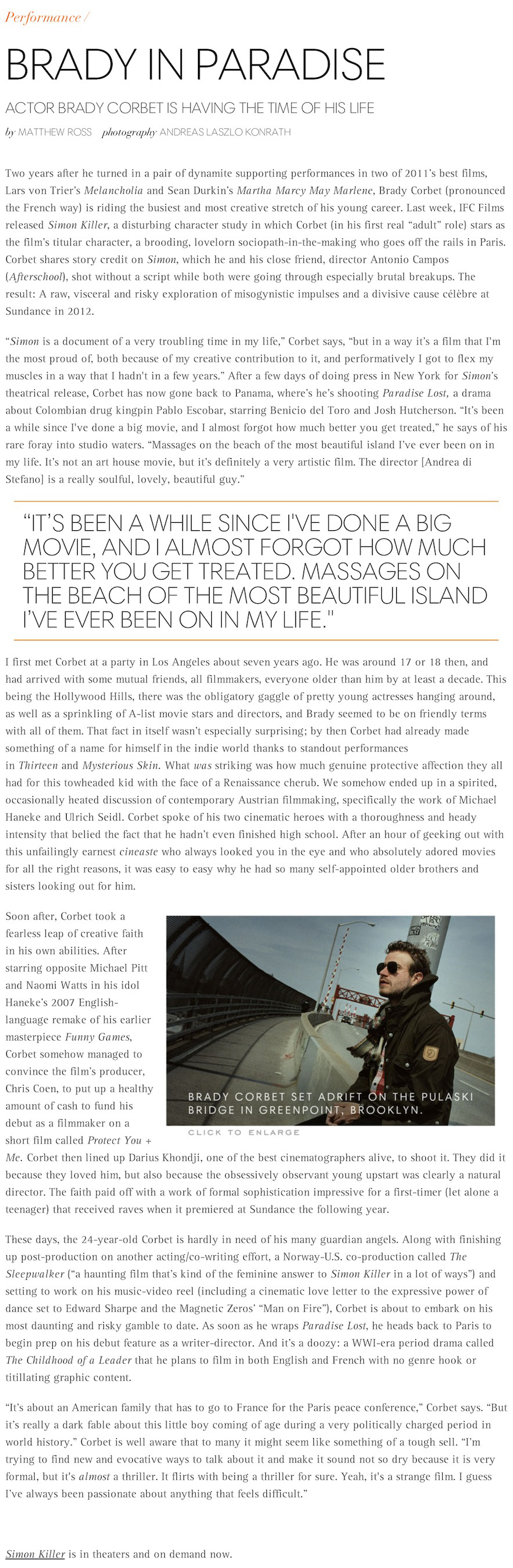 Feature profile of actor/filmmaker Brady Corbet for The Aesthete (theaesthete.com). April 2013.