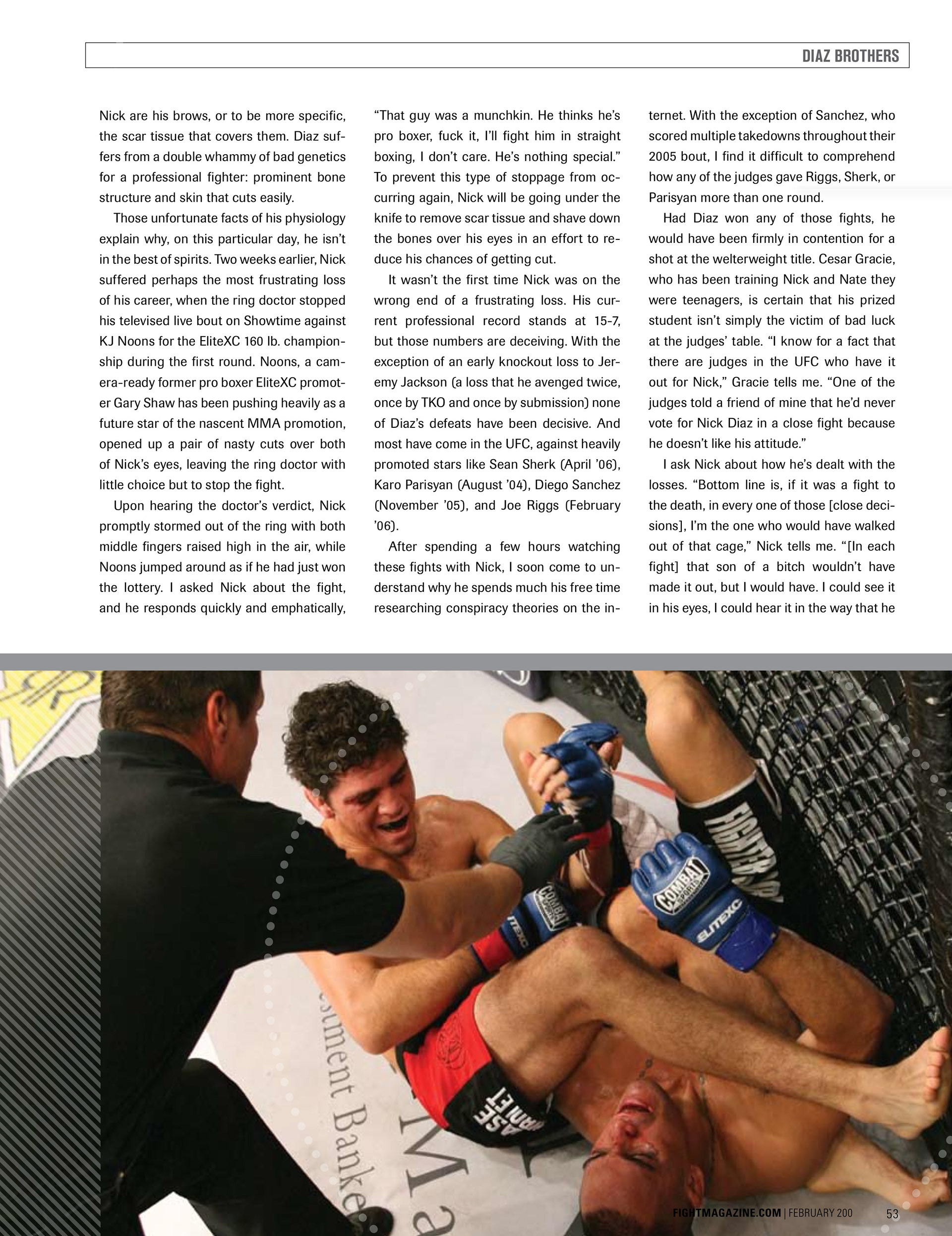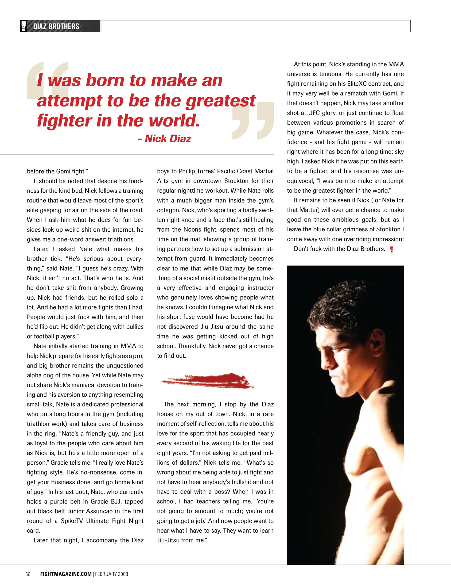 Feature profile of controversial fighting brothers Nick and Nate Diaz for FIGHT! Magazine. Published Feb. 08. 3500+ words.