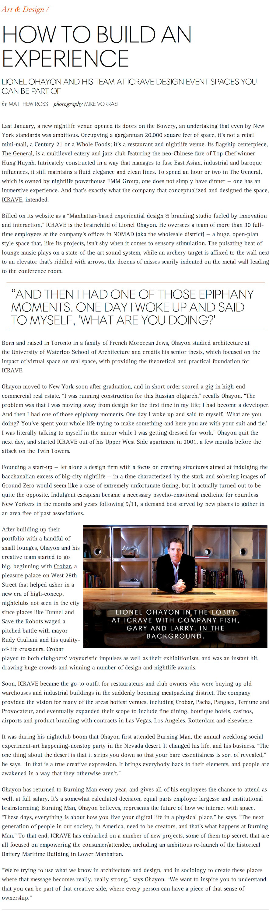 Feature story on New York design firm iCrave and its president, Lionel Ohayon for The Aesthete (theaesthete.com). April 2013.