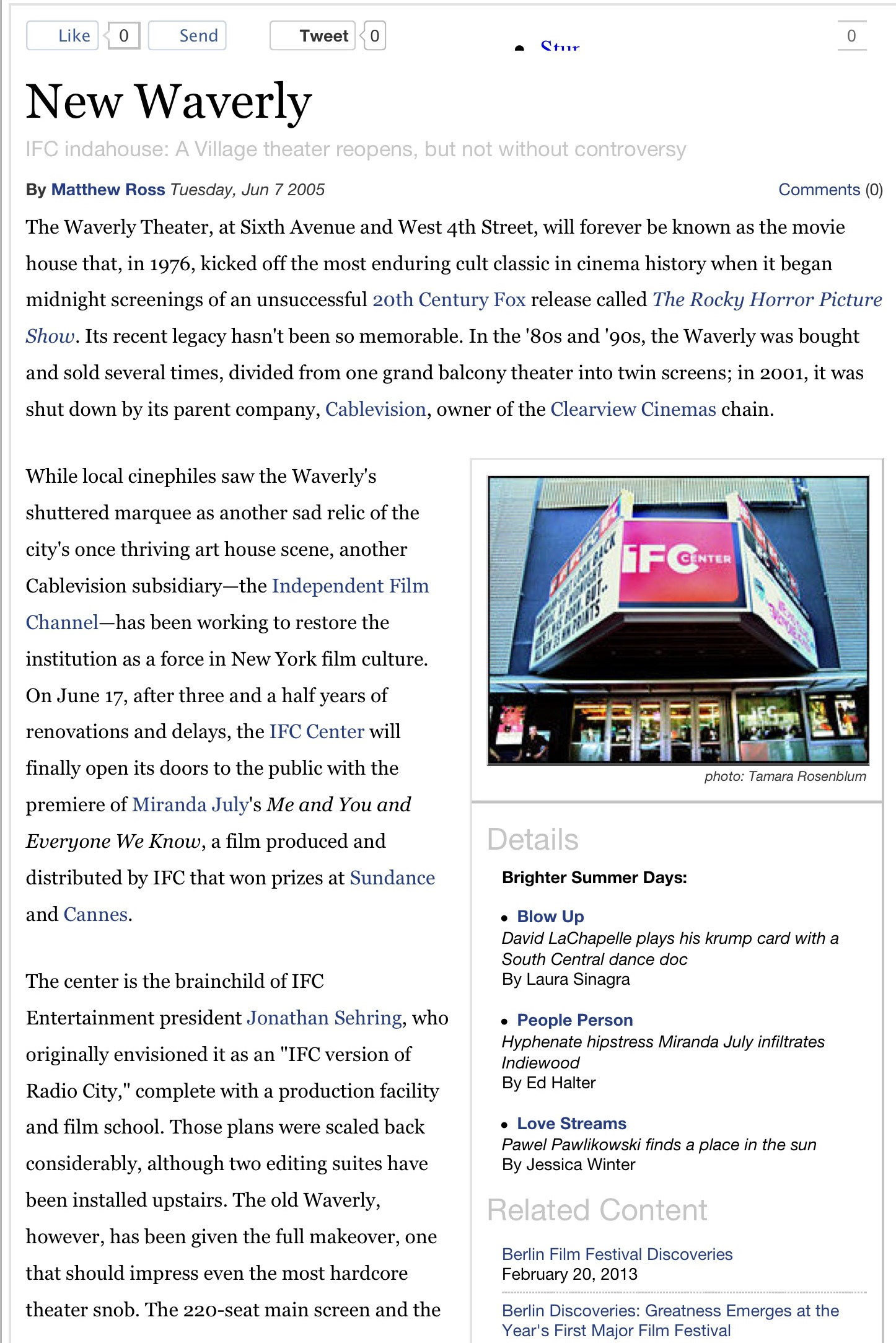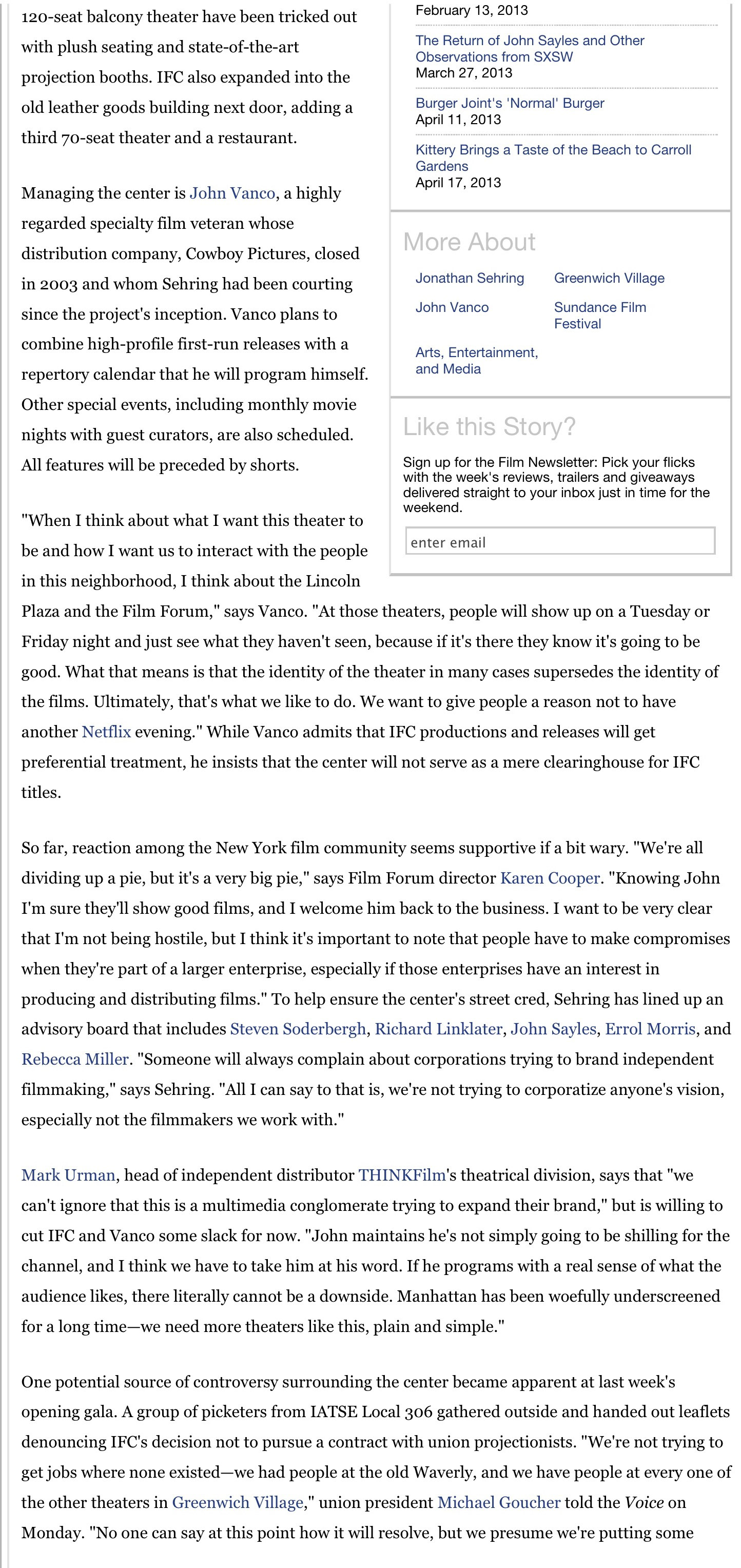 Reported news story on the opening of the IFC Center in Greenwich Village. Online article scan (not print edition).