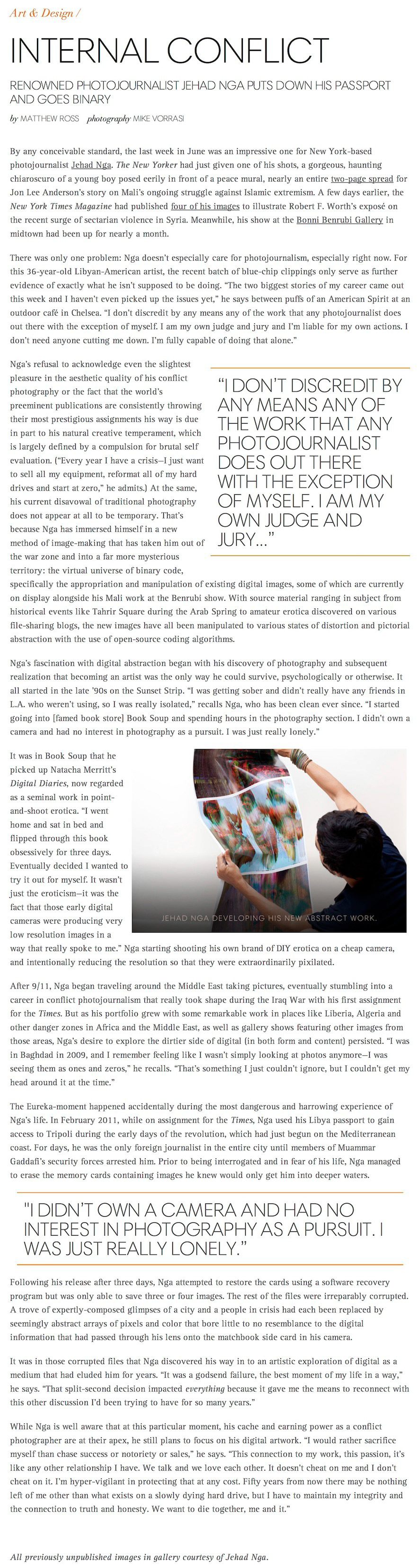 Feature profile on photographer Jehad Nga for The Aesthete (theaesthete.com). July 2013.