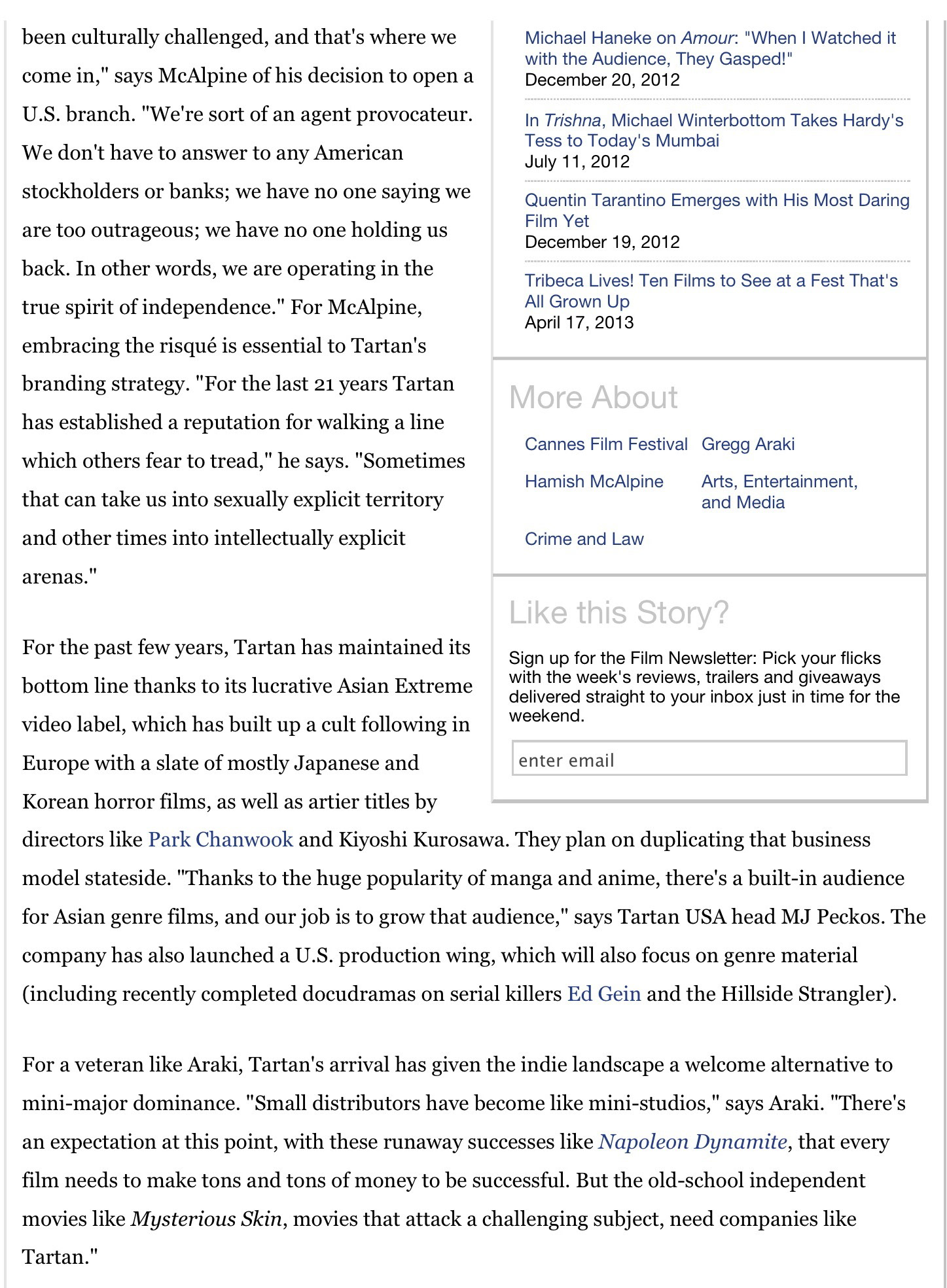 Reported feature for the Voice's movie section on risqué film distributor Tartan Films. (Scan of online version, not print edition.)